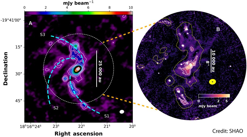 El equipo científico realizó observaciones en longitudes de onda milimétricas en la región de formación estelar IRAS 18134-1942. Utilizando el observatorio ALMA (Atacama Large Millimeter/submillimeter Array) ubicado en la región de Antofagasta, identificaron un sistema sorprendentemente organizado -análogo a una galaxia espiral barrada- compuesto por tres brazos espirales que, desde las escalas más grandes, alimentan una barra central que canaliza el gas hacia un pseudodisco que envuelve una estrella masiva “en gestación”.