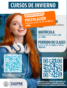 Estimadas y Estimados Estudiantes: La Dirección General de Pregrado (DGPRE) informa que se encuentra abierta la postulación a los Cursos de Invierno.Invitamos a nuestros estudiantes de Antofagasta y Coquimbo a conocer todos los detalles de los cursos escaneando el código QR o ingresando a los enlaces Conocer Reglamento, y Postulaciones y Matrículas. El periodo de postulación […]