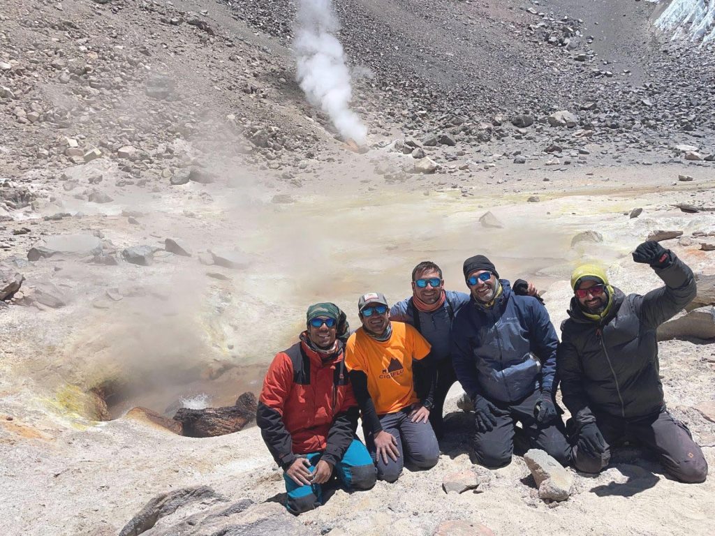 Manuel Inostroza junto a los volcanólogos Gabriel Ureta, Mauricio Aguilera y Felipe Aguilera, este último director de Ckelar Volcanes, instituto surgido desde la Universidad Católica del Norte (UCN), ascendieron al cráter del volcán activo para tomar muestras de fluidos volcánicos, un hito para la historia científica y la comunidad volcanológica de Chile y el mundo. ¿El objetivo?: Conocer más del origen magmático-hidrotermal de las emisiones volcánicas, pero también saber cuál es el nivel de actividad de Ojos del Salado.