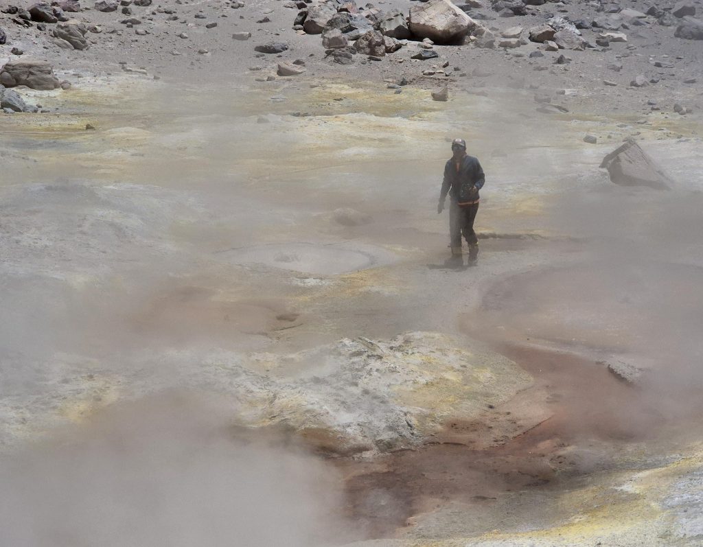El equipo de científicos trabajó intensamente durante cuatro horas en las fumarolas del volcán, tomando muestras de gas y agua. “El lugar es fantástico para investigación volcanológica, dice el doctor Felipe Aguilera, ya que hay fumarolas, fumarolas jet –que salen a alta velocidad y presión, y que suenan como una turbina de avión–, piscinas burbujeantes, piscinas de barro, y el agua se junta con un mini riachuelo que termina en la laguna que está siempre congelada”.