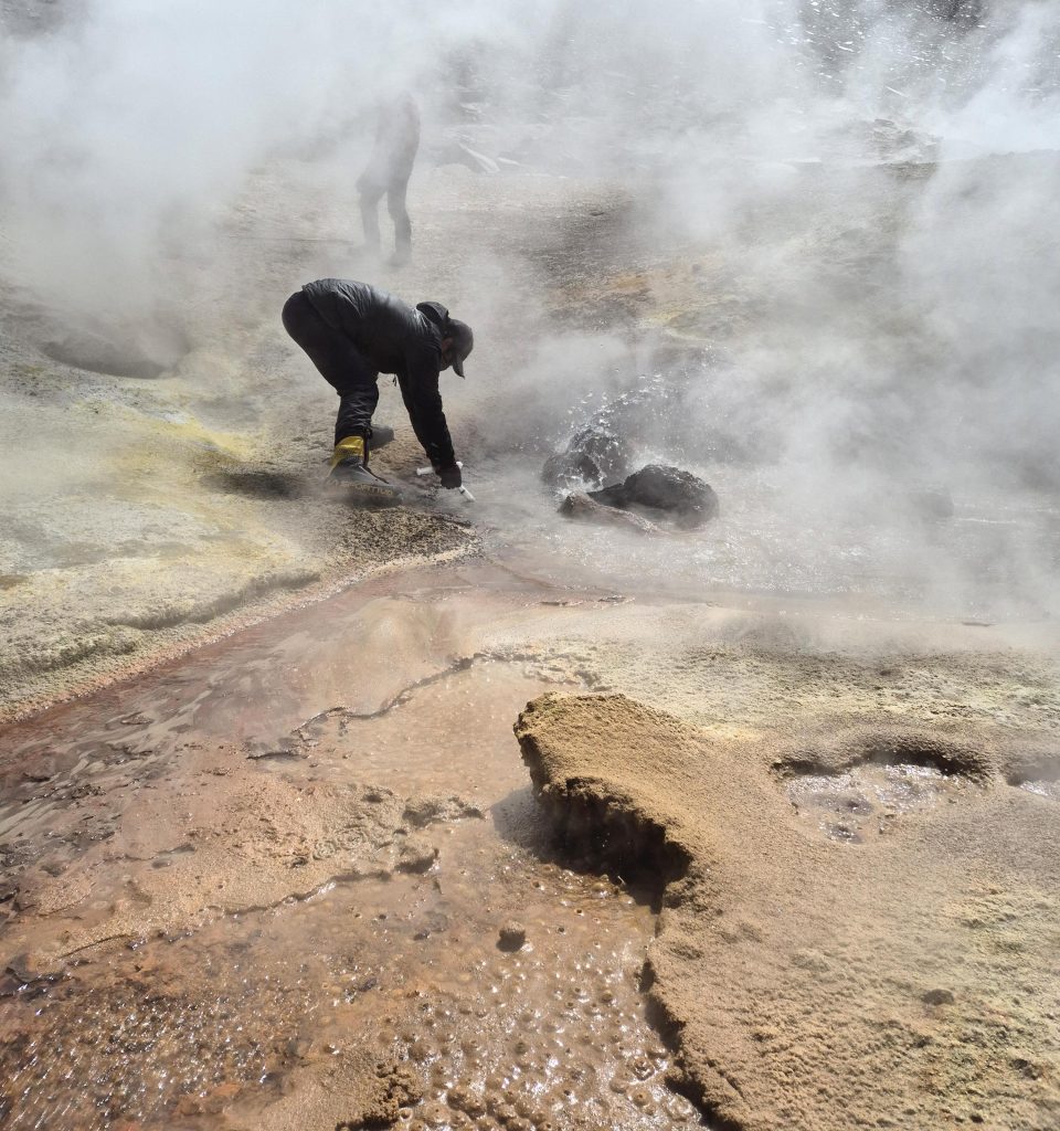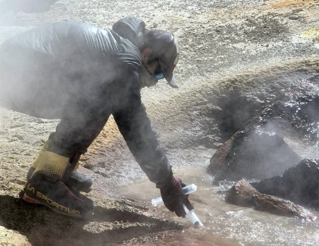 En tanto, el doctor Manuel Inostroza comenta que al llegar a la zona en donde se encuentran las emisiones, fue tremendamente sorprendente encontrar emisiones de agua en ebullición y diversas manifestaciones termales similares a lo que se puede encontrar en un campo geotérmico. “Incluir el kit de muestreo de aguas en nuestro equipaje científico fue un acierto, ya que teníamos muy poca información de lo que había en el sitio y el muestreo ‘tradicional’ de volcanes similares al Ojos del Salado sugería sólo muestreo de gases”, añade.