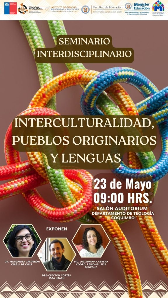 El Departamento de Teología Coquimbo de la UCN y el Núcleo de Investigación en Interculturalidad UCN invitan a participar del seminario interdisciplinario “Interculturalidad, Pueblos Originarios y Lenguas”, que se realizará este viernes 23 de mayo a las 9:00 hrs en el Salón Auditorium María Cecilia Ramírez de la Universidad Católica del Norte (UCN), en su Sede Coquimbo, ubicada en Larrondo 1281.