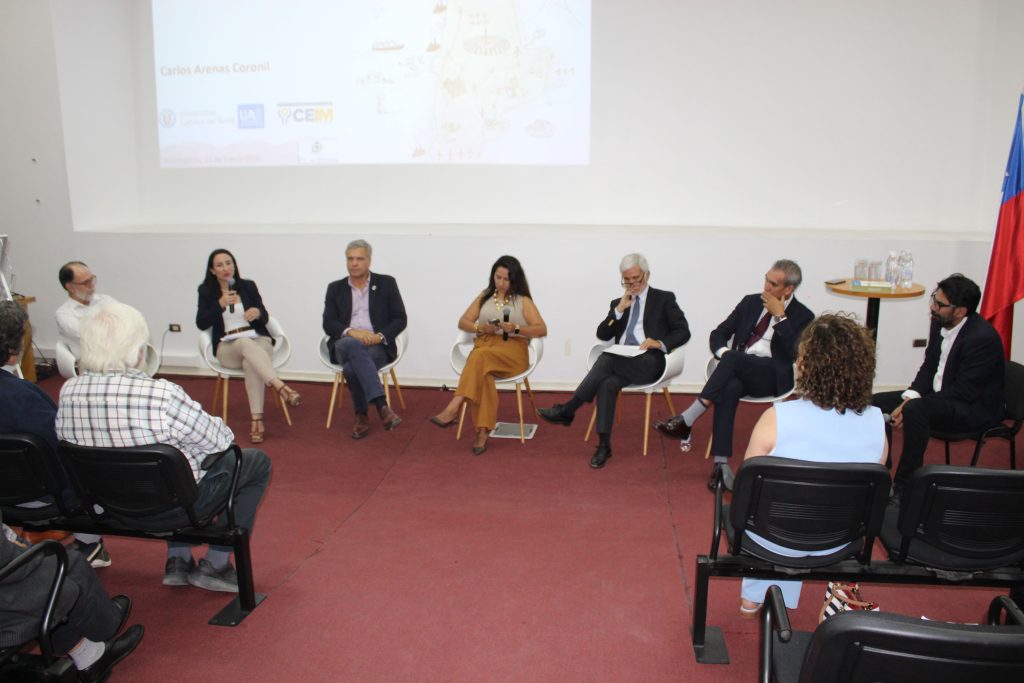 Participaron en esta mesa el académico de la UCN, Dr. José Antonio González; la secretaria regional ministerial de Energía Región de Antofagasta, Dafne Pino; el alcalde de Antofagasta, Sacha Razmilic; la directora y fundadora de Norte y Energía, Paola Quezada; el gerente general de la Asociación de Industriales de Antofagasta (AIA) Fernando Cortés; el compilador del libro, Carlos Arenas; y el director de El Mercurio de Antofagasta, Víctor Toloza, quien participó como moderador.