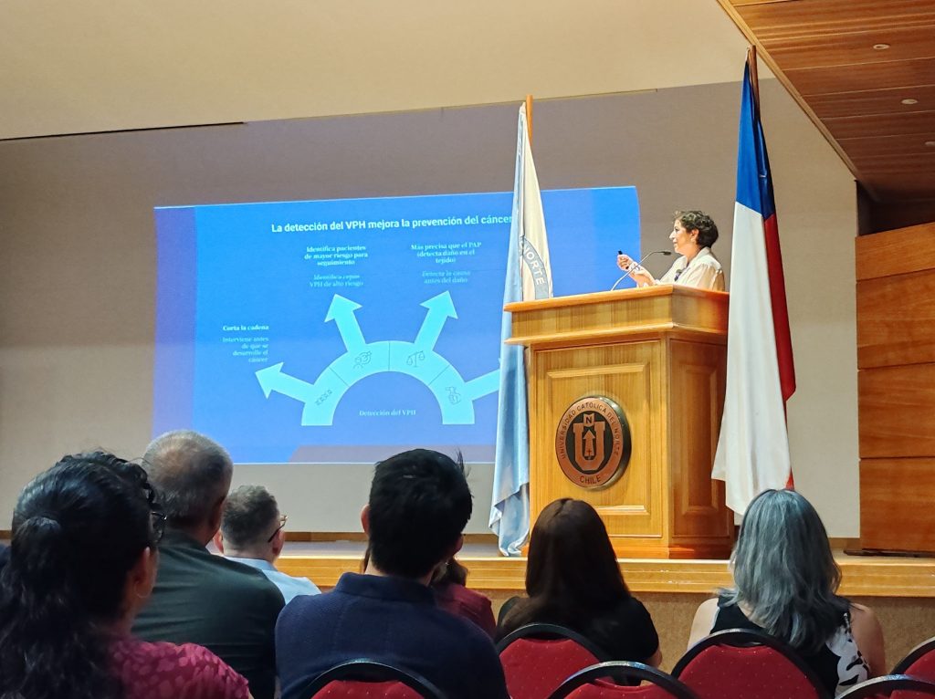 Durante la charla magistral desarrollada en el marco del lanzamiento de la iniciativa, la Dra. Muriel Ramírez abordó la importancia de la detección del virus del papiloma humano para la prevención del cáncer cervicouterino en mujeres, y cómo esta prueba innovadora, a través de muestras de orina, va a permitir un mejor acceso al diagnóstico precoz.